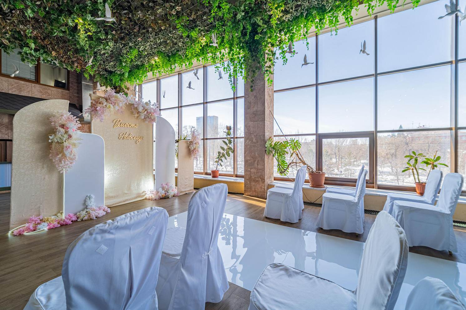 Уединенный торжественный зал с отдельным входом, оформленный в нейтральных синих и бежевых тонах, что дает возможность декорировать зал под желания гостей.